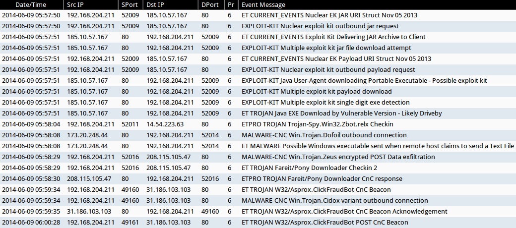- 2014-06-09 05:57:50 UTC - 185.10.57[.]167:80 - ET CURRENT_EVENTS Nuclear EK JAR URI Struct Nov 05 2013 (sid:2017666)