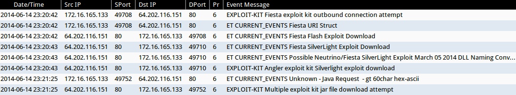 - 2014-06-14 23:20:42 UTC - 64.202.116[.]151:80 - EXPLOIT-KIT Fiesta exploit kit outbound connection attempt (sid:29443)