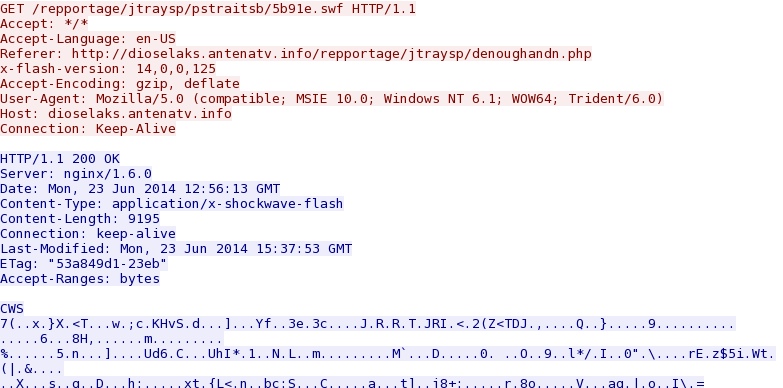 Here's the Flash exploit sent for the failed infection attempt on the IE 10 VM with up-to-date Flash and Java: