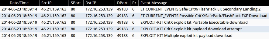 - 2014-06-23 18:59:19 UTC - 46.21.159[.]163:80 - ET CURRENT_EVENTS Possible CritX/SafePack/FlashPack EXE Download (sid:2017297)