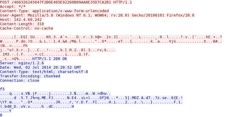 - 2014-07-02 20:21:00 UTC - 142.4.60[.]242:443 - 142.4.60[.]242:443 - POST /460326245047F2B6E405E92260B09AA0E35D7CA2B1