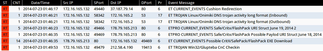 - 2014-07-23 01:46:35 UTC - 178.79.165[.]213:80 - ET CURRENT_EVENTS Possible CritX/SafePack/FlashPack EXE Download (sid:2017297)
