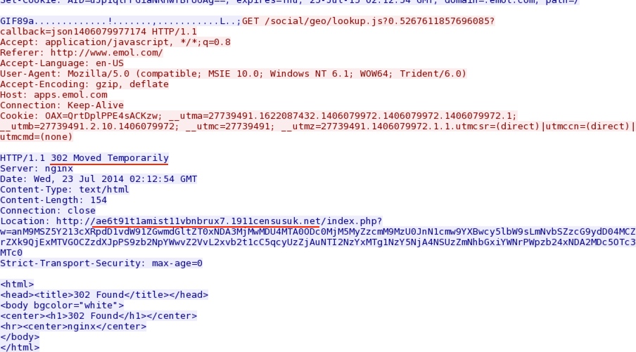 - 01:44:49 UTC - 184.154.117[.]170:80 - apps.emol[.]com - GET /social/geo/lookup.js?0.5267611857696085?callback=json1406079977174
