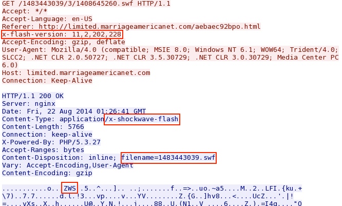 - 00:25:38 UTC - 87.117.255[.]66:80 - limited.marriageamericanet[.]com - GET /1483443039/3/1408645260.swf