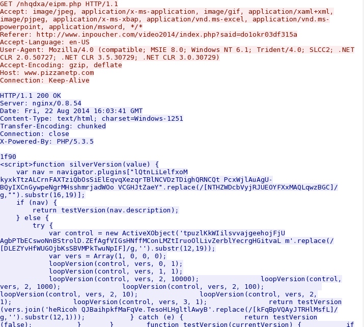 - 2014-08-22 16:03:44 UTC - 76.74.157[.]161:80 - www.pizzanetp[.]com - GET /nhqdxa/vpclcy.x [Silverlight exploit]