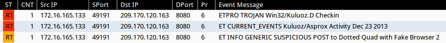 - 209.170.120[.]163:8080 - ET CURRENT_EVENTS Kuluoz/Asprox Activity Dec 23 2013 (sid:2017895)