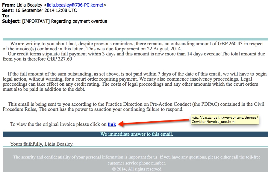 - Conrad Longmore blogged about this campaign at: https://blog.dynamoo.com/2014/09/unpaid-invoice-notification-spam-leads.html