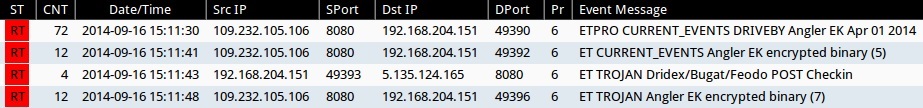 - 2014-09-16 15:11:30 UTC - 109.232.105[.]106:8080 - ETPRO CURRENT_EVENTS DRIVEBY Angler EK Apr 01 2014 (sid:2807913)