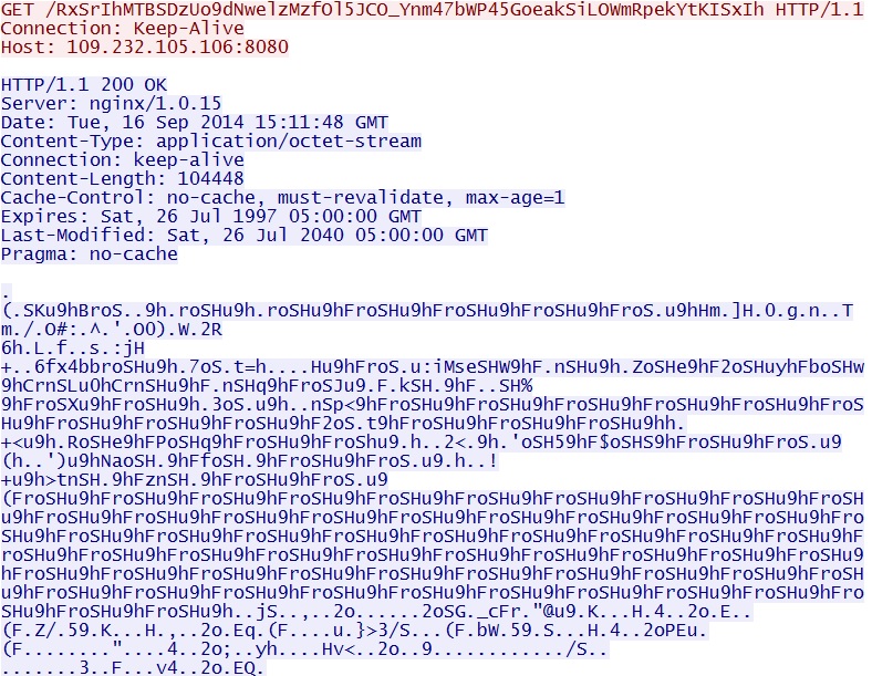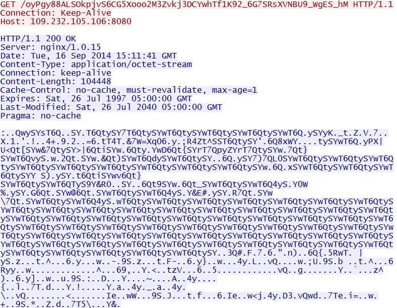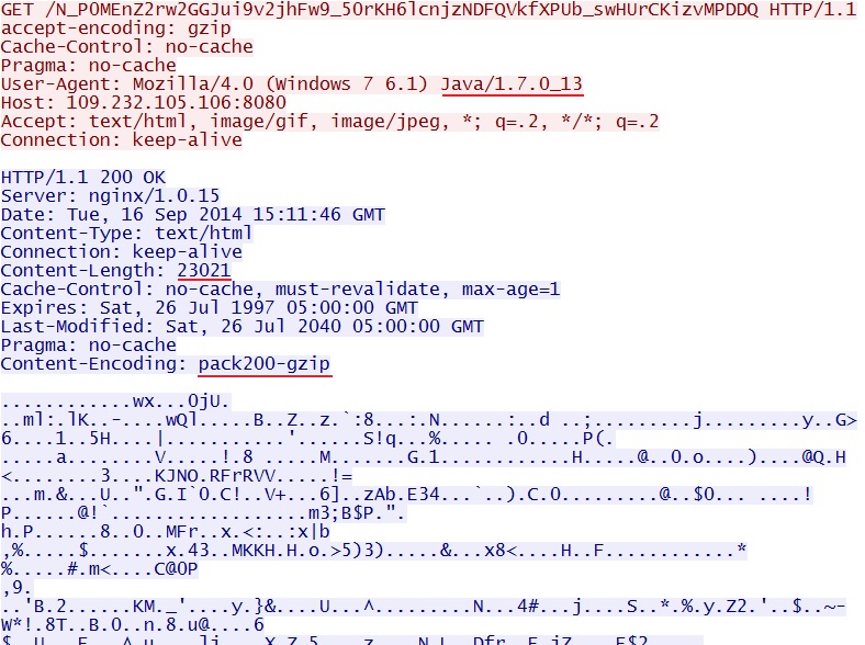 - 2014-09-16 15:11:48 UTC - 109.232.105[.]106:8080 - [1:31694:1] EXPLOIT-KIT Angler exploit kit encrypted binary download