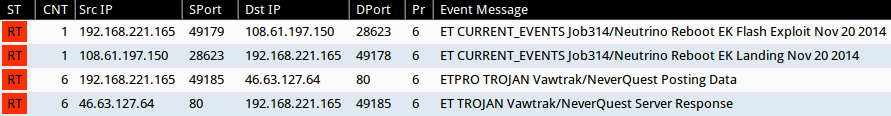 - 108.61.197[.]150 port 28623 - ET CURRENT_EVENTS Job314/Neutrino Reboot EK Landing Nov 20 2014 (sid:2019761)