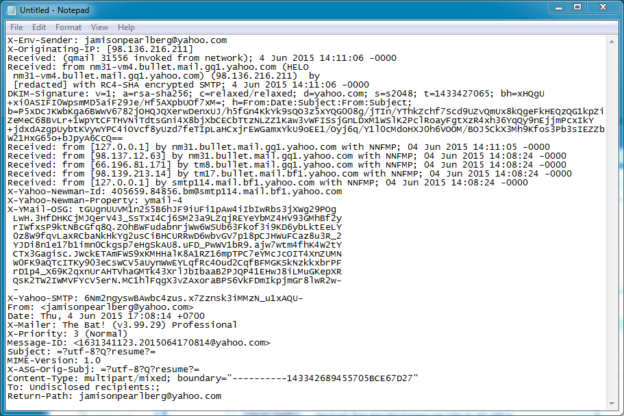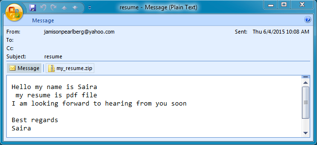I know you guys probably get all sorts of these reports, but I just received a phishing email. Sending address is jamisonpearlberg@yahoo[.]com with a subject of "resume". The message body says:
