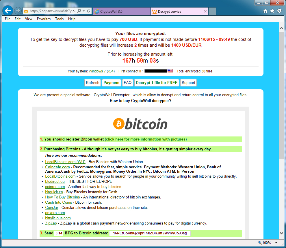 And the infected host in my lab environment quickly showed signs of a CryptoWall 3.0 ransomware infection. The bitcoin address for the ransom payment was: 16REtGSobiQZoprFnXZBR2mSWvRyUSJ3ag. A quick check on blockchain[.]info showed 2 transaction on this bitcoin account from April and May of 2015.