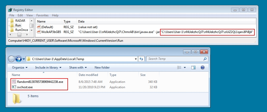 The malware created a folder at C:\Users\[username]\nNUekzhcQJ7 with multiple sub-directories and a large number of files. I've got a complete list in a text file "list-of-other-files.txt" in the archive 2015-08-06-Adwind-infection-additional-artifacts.zip. About 8 minutes after opening the Adwind .jar file, two files appeared in the C:\Users\[username]\AppData\Loca\Temp (see image below).