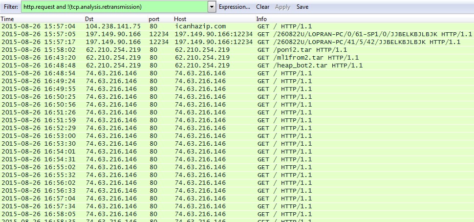 Shown below: HTTP traffic from the pcap. I let the infected host run well over an hour.