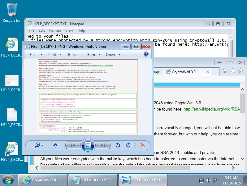 Shown above: Desktop after the CryptoWall 3.0 ransomware infection.