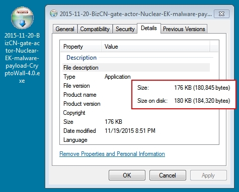 Shown above: CryptoWall ransomware sample retrieved from the infected host.