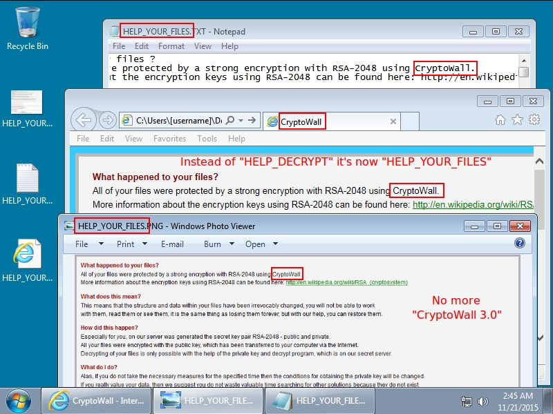 Shown above: Desktop of the infected host after the CryptoWall ransomware infection.