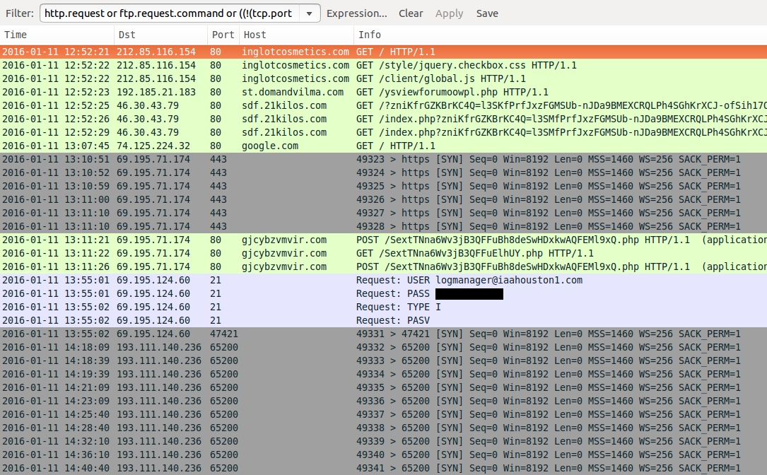 - 2016-01-11 13:55:01 UTC - 69.195.124[.]60 port 21 - FTP traffic, user: logmanager@iaahouston1[.]com