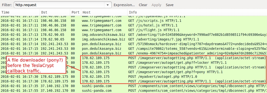 Shown above: Traffic from my 2016-02-02 infection filtered in Wireshark.