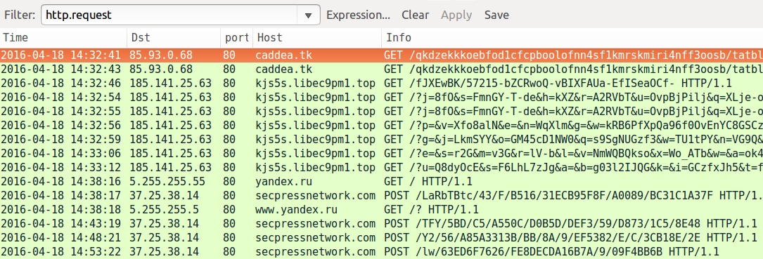 Shown above: Pcap of the pseudo-Darkleech Angler EK infection traffic filtered in Wireshark.