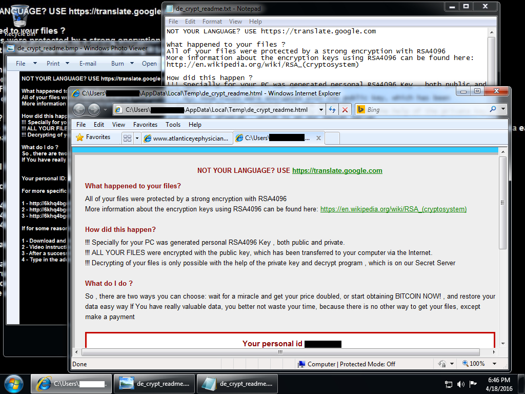 Shown above: Desktop of the infected Windows host with CryptXXX ransowmare artifacts after pseudo-Darkleech Angler EK caused the Bedep infection.