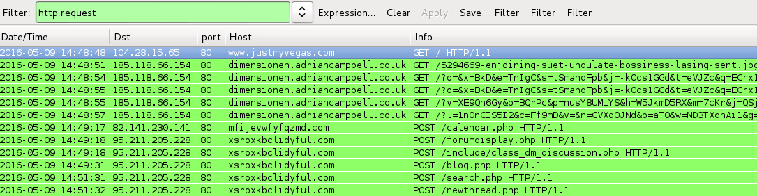 Shown above: Pcap of the traffic on a VM filtered in Wireshark. It's good up through the first Bedep post-infection traffic on 82.141.230[.]141.