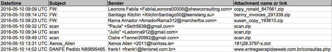 Shown above: Data from the .csv spreadsheet on 8 malicious emails from today.