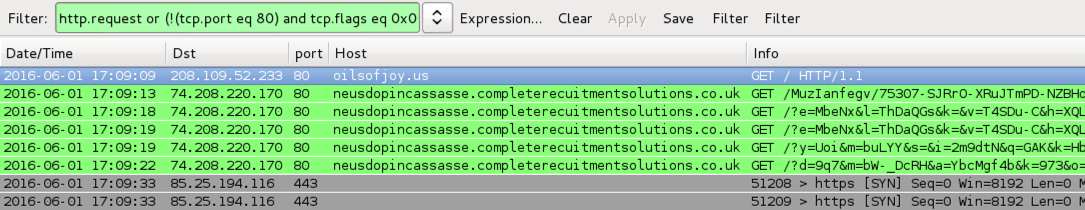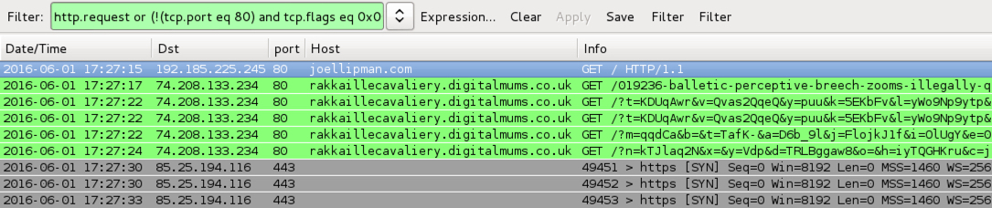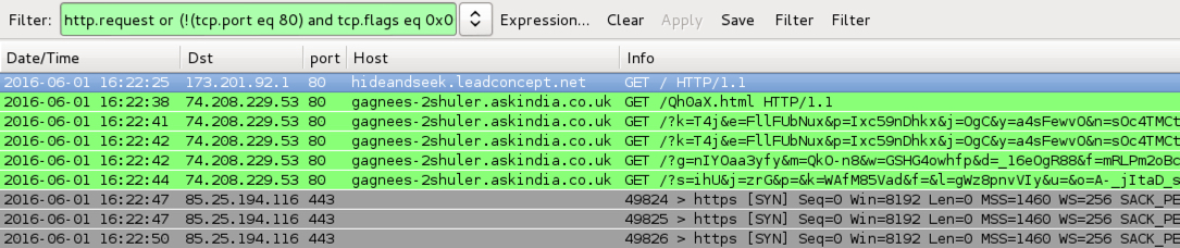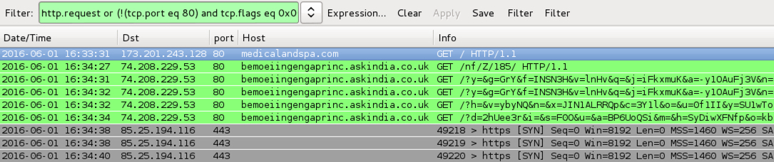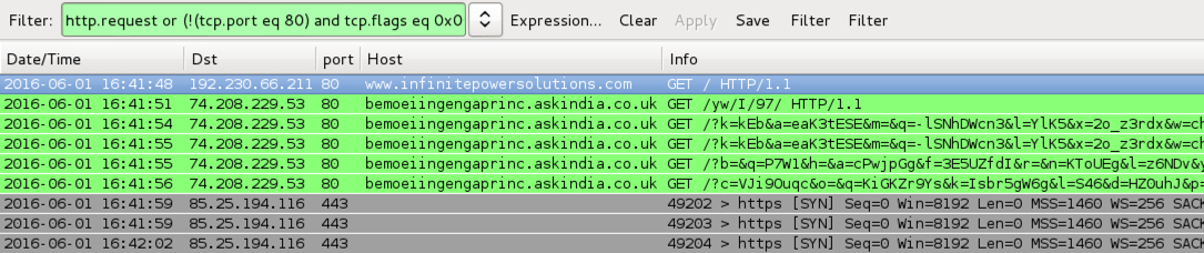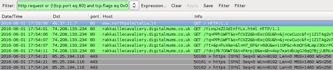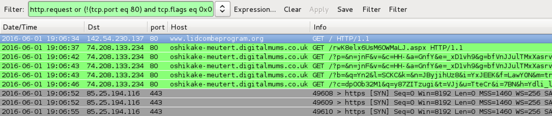 Shown above: Traffic from the pcaps filtered in Wireshark using the filter: http.request or (!(tcp.port eq 80) and tcp.flags eq 0x0002)