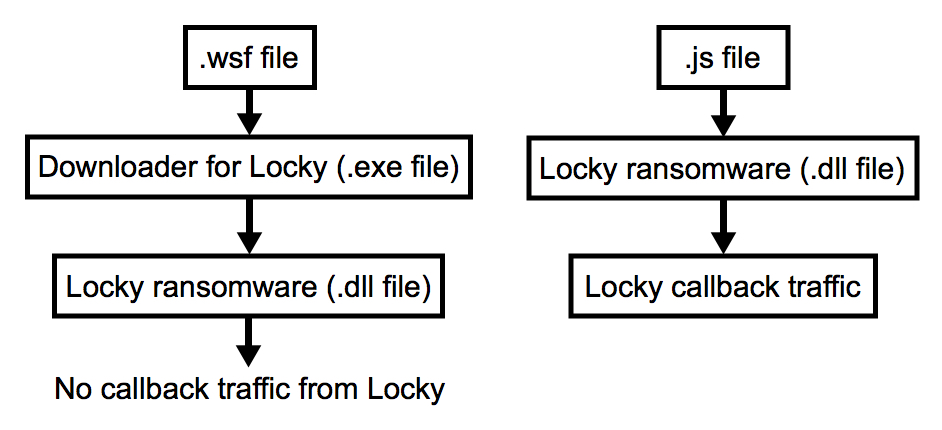 Shown above: Flow chart for two different examples of Locky ransomware infections from today's emails.