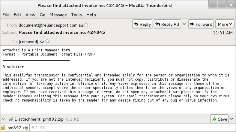 - <document@reliancesport[.]com[.]au> - Subject: Please find attached invoice no: 424845