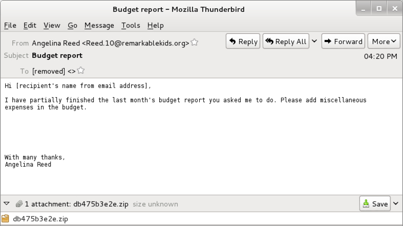 - "Angelina Reed" <Reed.10@remarkablekids[.]org> - Subject: Budget report