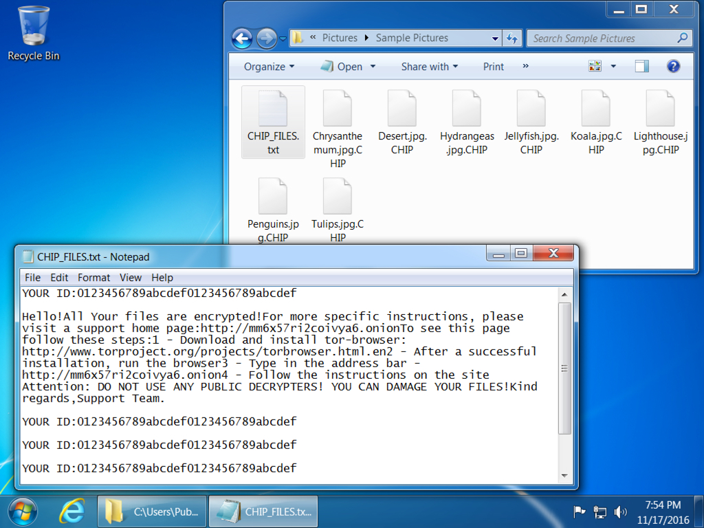Shown above: An infected Windows host with a folder showing the encrypted files and CHIP_FILES.txt decryption instructions.