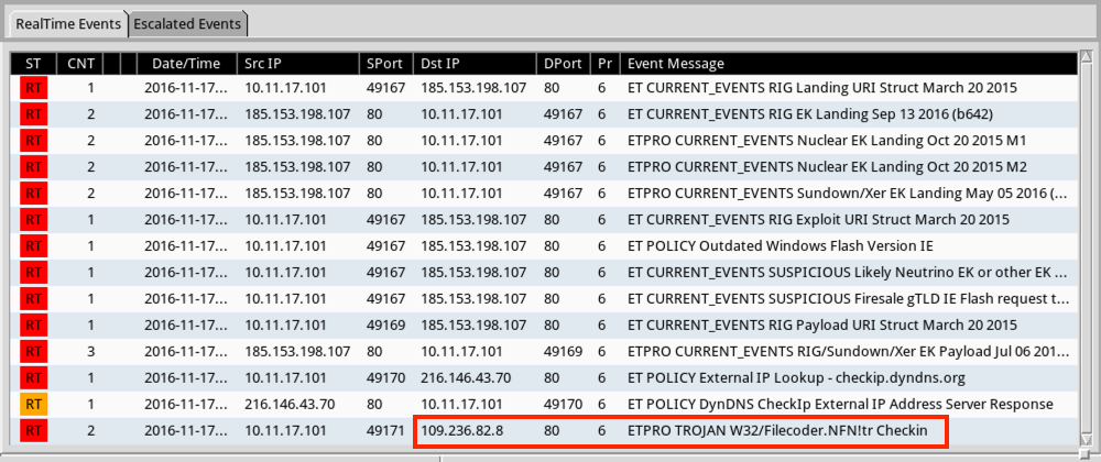 Shown above: Alerts using tcpreplay on the pcap with the Emerging Threats Pro (ETPRO) ruleset using Sguil on Security Onion.