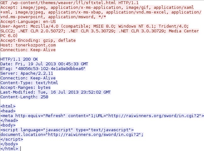 - 2014-07-19 00:45:33 UTC - 192.168.204[.]150:54616 - 91.186.20[.]51:80 - tonerkozpont[.]com - GET /wp-content/themes/weaver/lfl/sftxtel.html