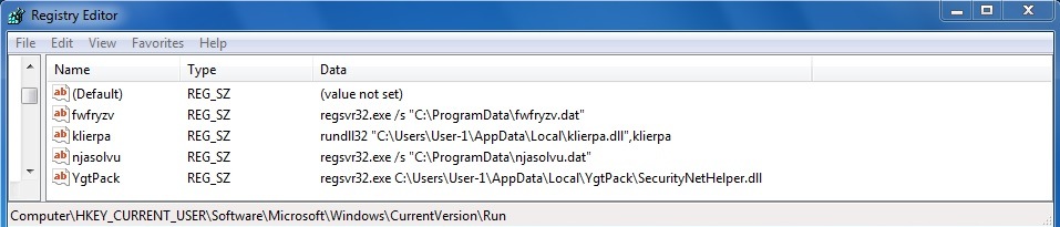 Registry entries in HKEY_CURRENT_USER\Software\Microsoft\Windows\CurrentVersion\Run created by the malware:
