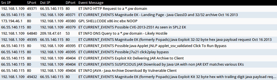 For this infection, Security Onion was used to monitor a physical host running an unpatched, 64-bit version of Windows 7 with Java 7 update 4 running IE 10. The infection traffic generated the following events in Sguil: