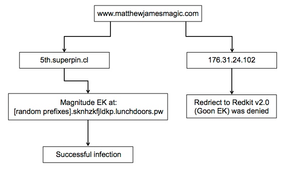 Looking through this traffic, I noticed two separate infection chains. First was the Magnitude EK infection chain. The other chain was an aborted redirect that matches what I've seen lately for Redkit v2.0 (Goon EK). A simple flow chart looks like this: