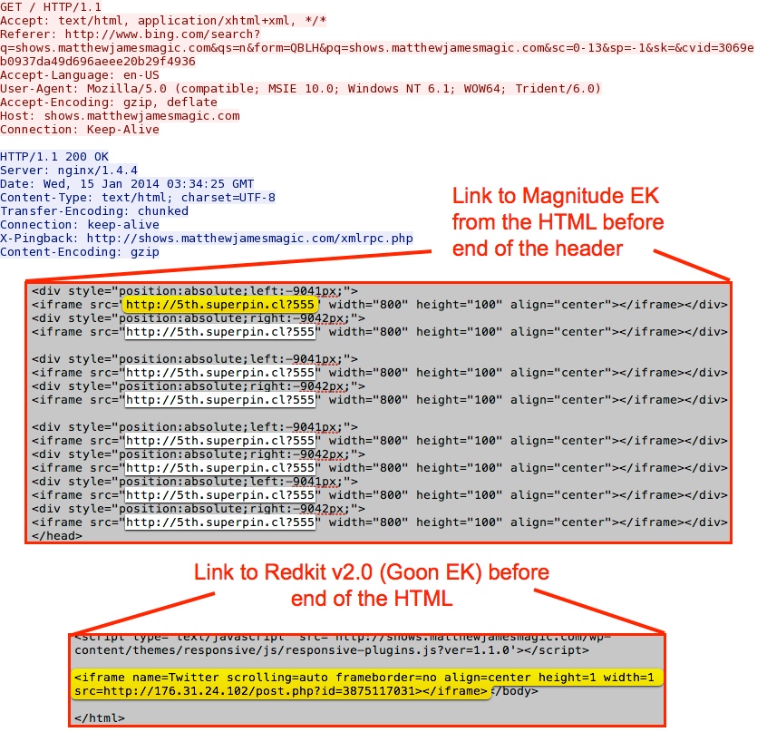 The Magnitude exploit kit (EK) was discovered last year. EmergingThreats started releasing signatures on this EK as early as September of 2013.