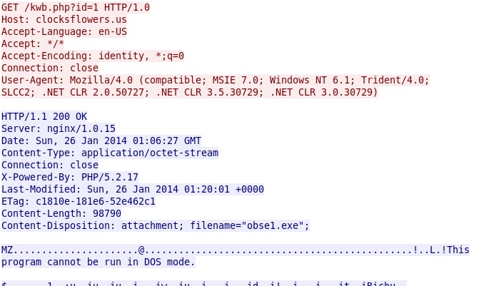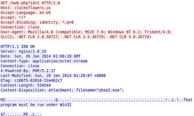 - 2014-01-26 01:05:37 UTC - 198.50.198[.]182 port 80 - clocksflowers[.]us - GET /kwb.php?id=2 HTTP/1.0