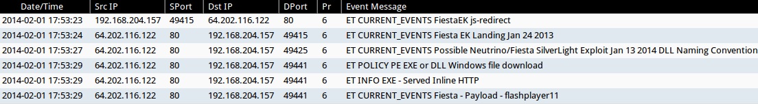 - 17:53:27 UTC - 64.202.116[.]122:80 - ET CURRENT_EVENTS Possible Neutrino/Fiesta SilverLight Exploit Jan 13 2014 DLL Naming Convention