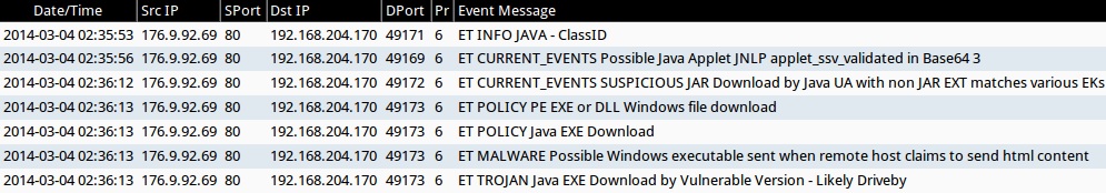 - 2014-03-04 02:36:12 UTC - 176.9.92[.]69:80 - ET CURRENT_EVENTS SUSPICIOUS JAR Download by Java UA with non JAR EXT matches various EKs