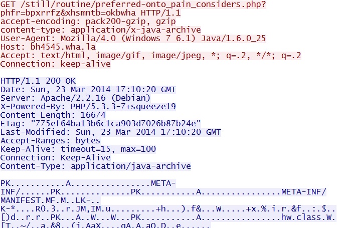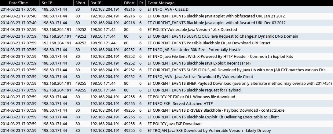 - 2014-03-23 17:07:59 UTC - 198.50.171[.]44:80 - ET CURRENT_EVENTS SUSPICIOUS JAR Download by Java UA with non JAR EXT matches various EKs