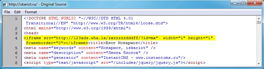 Embedded iframe in web page from compromised server - iskariot[.]ru/