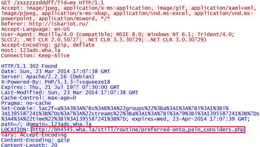 - 2014-03-23 17:07:38 UTC - 144.76.161[.]34:80 - 123ads.wha[.]la - GET /zxzzzzzdddff/?id=mx
