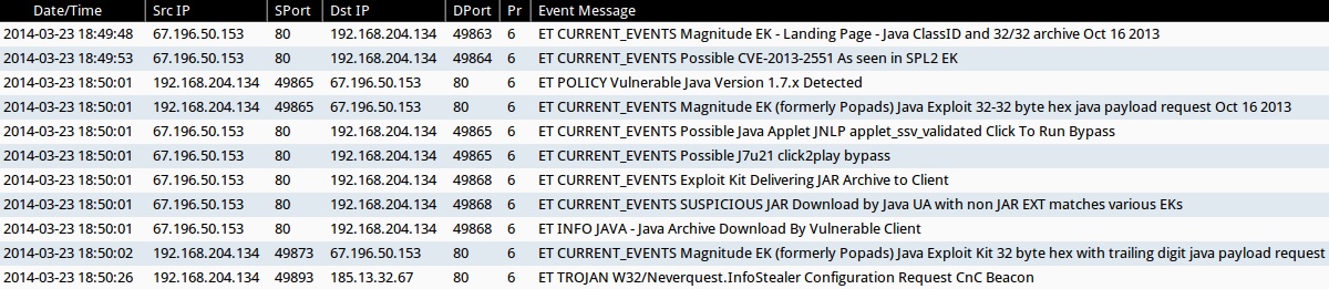 - 2014-03-23 18:50:02 UTC - 67.196.50[.]153:80 - ET CURRENT_EVENTS Magnitude EK (formerly Popads) Java Exploit Kit 32 byte hex with trailing digit java payload request