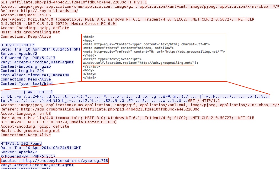 - 2014-04-10 07:39:48 UTC - 66.96.223[.]199:80 - ET CURRENT_EVENTS EvilTDS Redirection