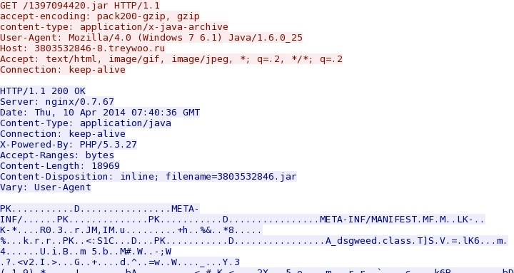 - 2014-04-10 07:39:54 UTC - 198.50.253[.]235:80 - ET INFO JAVA - Java Archive Download By Vulnerable Client
