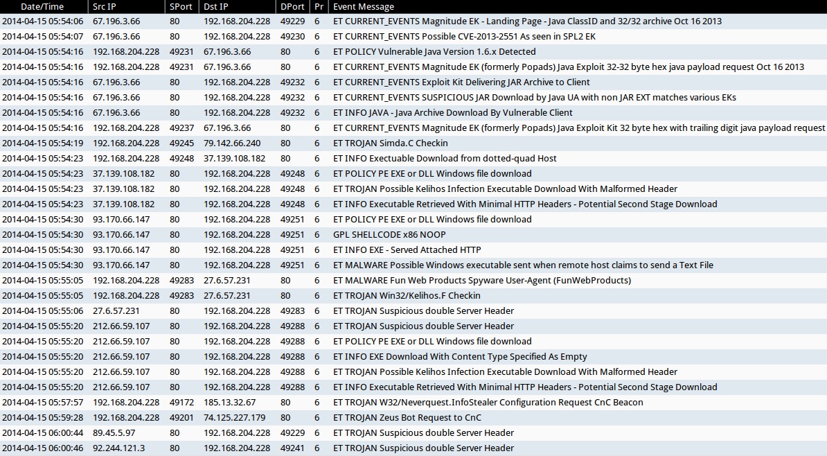 - 2014-04-15 05:54:16 UTC - 67.196.3[.]66:80 - ET CURRENT_EVENTS Magnitude EK (formerly Popads) Java Exploit 32-32 byte hex java payload request Oct 16 2013