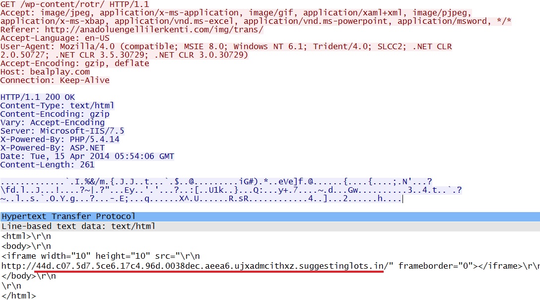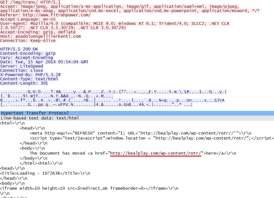- 05:54:06 UTC - bealplay[.]com - GET /wp-content/rotr/
